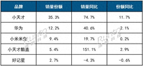 小天才以35.3%的销量份额蝉联冠军,同比增幅74.7%,市场份额同比增长11.7%。
